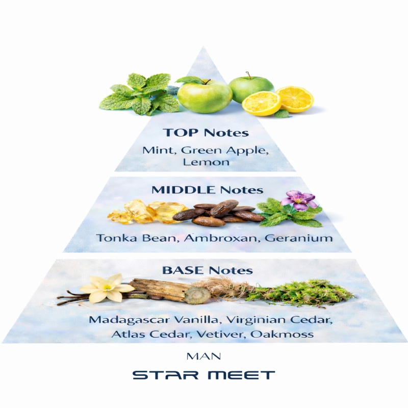A fresh burst of mint, apple, and lemon meets a warm heart of tonka and ambroxan, finishing with rich vanilla and deep woods.